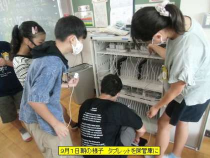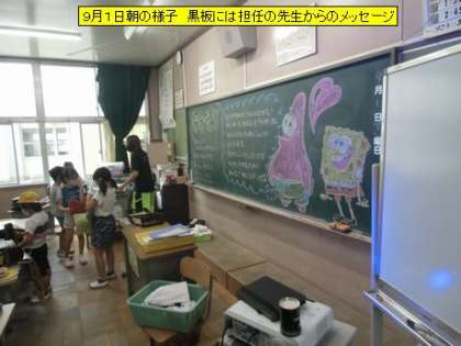 子どもたちが教室に入ると、担任の先生からのメッセージが黒板に書かれていました。待ちに待った学校生活が楽しくなるといいと思います。朝の支度をしたり、タブレットを保管庫にしまったりして、夏休み後区切りの会を静かに教室で待ちました。