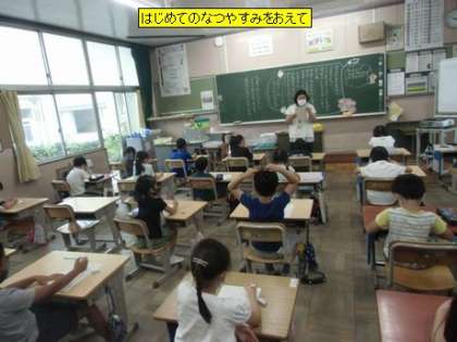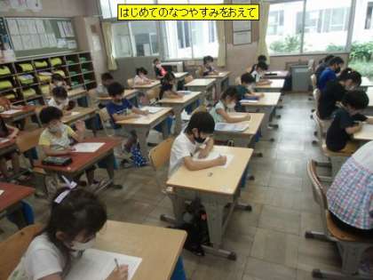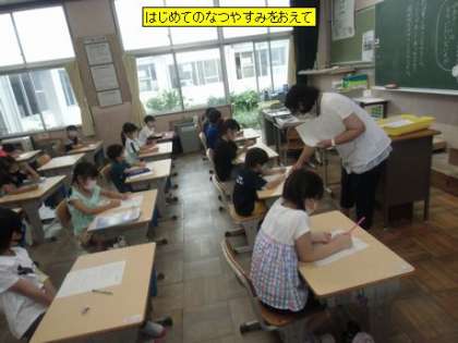 1年2組では、小学校に入って初めての夏休みを振り返っていました。夏休みの思い出や毎日の生活を、振り返りカードを使って書き込んでいました。アサガオの水やりや宿題のこと、夏休みの一番の思い出について書いていました。