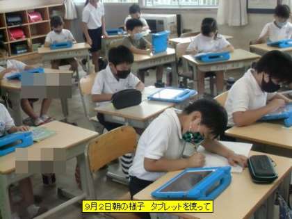 6・7・8組ではいつものように朝の体操がスタートするところでした。体を動かして、スウィッチオンです。朝の時間をタブレットを使って過ごしています。いろいろな学習ソフトで勉強ができます。6年生は夏休み復習テストに向けてテスト勉強をしていました。すごい集中力です。