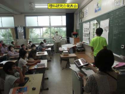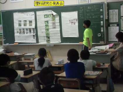 4年3組の理科の授業は、夏休みの課題として理科研究に取り組んだ子の発表会を行っていました。学校で勉強したことをさらに深く調べた子や自分の興味のあること・不思議に思ったことを納得いくまで調べた子がいました。用紙いっぱいに調べたことがまとめられていて興味深く聞くことができました。