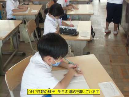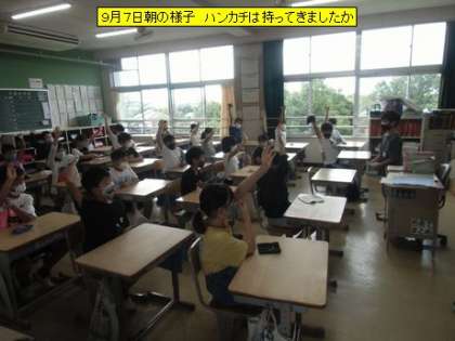 朝、教室を回ると、1年生の子が一生懸命黒板を見て明日の連絡を連絡帳に書いていました。一文字一文字ていねいに書いています。連絡帳を書き終わった子からアサガオの様子を見にきます。「アサガオのたねがとれたよ」と見せてくれました。4年生の教室では、係の子が「ハンカチは持ってきましたか」と訊いていました。全員の子がハンカチを高く上げました。ハンカチは必需品です。