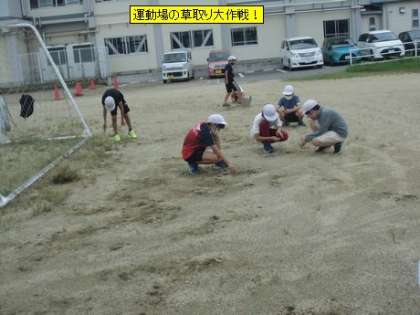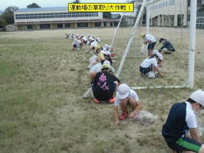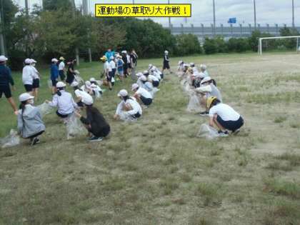 今日から4年生以上の外庭そうじの当番の子を集めて、運動場の草取り大作戦を行っています。日ごろの体育の授業やスポーツフェスティバル(運動会)などに向けてグランドををきれいにしたいと思います。今日1日だけでもずいぶんきれいになりました。