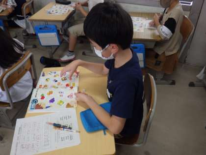 自分の好きなもののイラストの上におはじきを置いてI like〜.と言う練習をしていました。