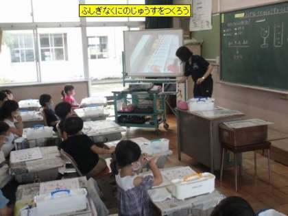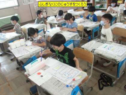 1年生は、図工の時間に初めて絵の具を使います。今日は、「赤、青、黄」の3源色をまぜて、いろいろな色を作ります。子どもたちは、絵の具を慎重にパレットに出し、いろいろな色を作って、ジュースを作っていました。混ぜ方によって違った色ができるので、楽しそうです。
