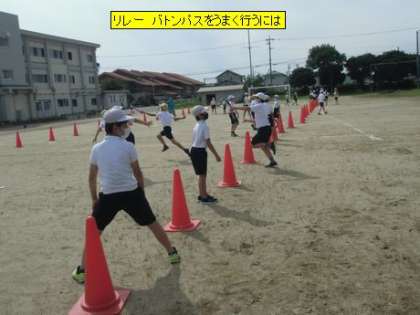 5年1組の皆さんが、運動場でリレーの授業を行っていました。今日の内容は、「バトンパス」です。コーンを2つ置き、その間でバトンパスをすることがねらいです。2人のスピードが合わず、バトンが渡らない場面やバトンを落としてしまう場面があり、その都度子どもたちは話し合っていました。原因が分かればうまくいきます。うまくバトンが渡った時はとてもうれしそうな顔をしていました。