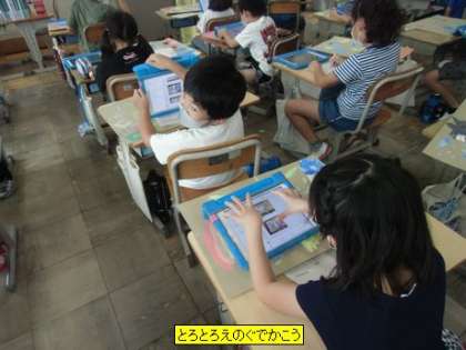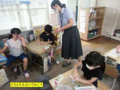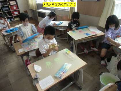 2年2組の皆さんも、「とろとろえのぐ」に挑戦していました。手や指につけた絵の具で、生き物を描きます。ぬるぬるした感じが気持ちが良かったり、悪かったり。思い切って画用紙の上に手をつけ、ついた手形に歓声が上がりました。タブレットに送られてきた友達の作品の鑑賞もしていました。