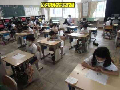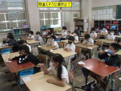 2年1組では、習った漢字のおさらいをしていました。「夜食」「空」「帰」。「空」という漢字は、「から」「あき」とも読みます。この読み方も2年生で習います。よく間違えてしまうのは「帰」だそうです。たくさん練習して書けるようになるといいですね。おさらいが終わったところで、テストが始まりました。