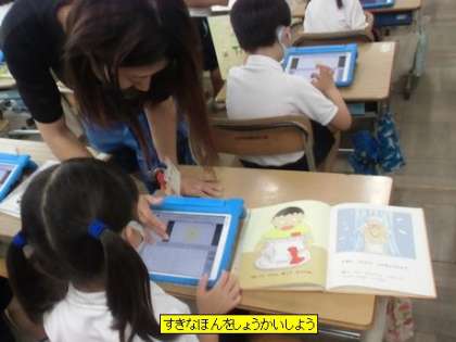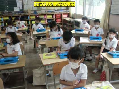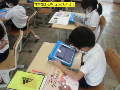 1年3組の皆さんの机の上には、図書室で借りてきた本が置いてあります。今日は、自分の好きな本をお友達に紹介します。「すきなところ」「おもしろいところ」など自分が好きな理由を書いて、お友達にも読んでもらいます。紹介された本を、また読んでくださいね。