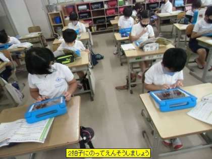 3年1組では、タブレットのアプリを使って、「ゆかいな木きん」の演奏が始まるところでした。まずは、音符を読むところから始まりました。まだ、階名に慣れていない子は教科書に書き込んでいます。準備ができたところで練習が始まりました。アプリですが、実際に鍵盤を弾いているように聞こえてきます。