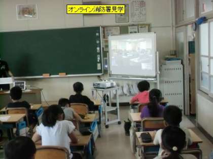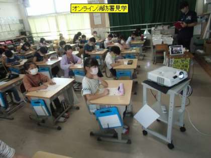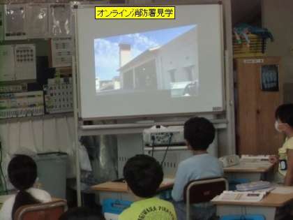 今日、3年生は、消防署末野原分署とオンラインでつないで、オンライン見学をさせてもらっています。署内の様子を映像で見させてもらい、同時に署員の方からの説明があります。消防署の仕組みや署員の方たちの仕事の様子を学習させてもらいます。授業の終わりには、子どもたちからの質問タイムも設けてもらいます。このオンライン見学は、消防署としては市内で初めての試みということです。
