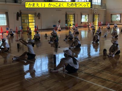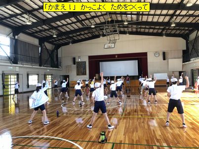 5年2組の今日の体育は、スポーツフェスティバルで演じる表現運動の練習です。オープニングの「かまえ!」のところは、ためをつくって「すとん」と腰を落とします。これから、5年生全員で一体感を意識して取り組んでいきます。