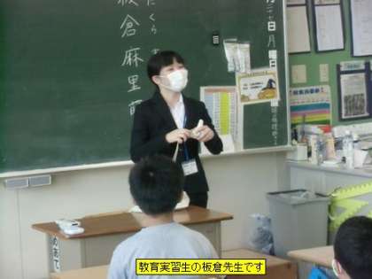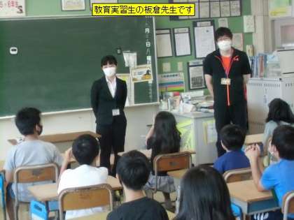 今日から後期の教育実習が、来月15日まで行われます。今回は、愛知教育大学から板倉麻里萌(いたくらまりも)先生が、先生になるための勉強を行います。配属は4年3組になります。どうぞよろしくお願いします。