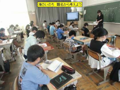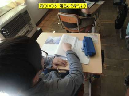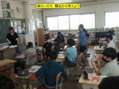 6年4組の国語は、立松和平さんの「海のいのち」の学習に入るところでした。はじめに、題名にもある「『いのち』とは」から授業が始まりました。子どもたちがイメージしている「いのち」についてたくさん意見が出ました。「一番大切なもの」「一つしかないもの」「人間がいただいているもの」など。その後、教科書の朗読をみんなで聞きました。