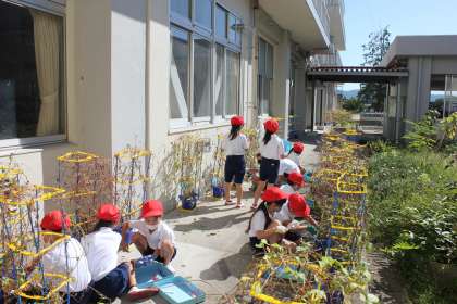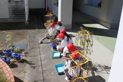 大切に育ててきたあさがおを使い、リースを作りました。2人1組で協力して、つるを切ったり、上手に円を作ったりできました。飾り付けをするのが楽しみです。