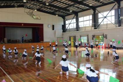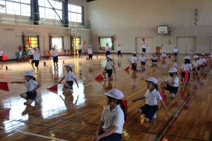 スポーツフェスティバルに向けて、旗を使った練習が始まっています。男子と女子で動きが違う場面もあり、リズムに乗りながら一生懸命覚えていました。