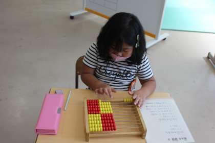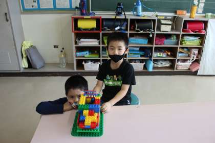 算数の授業では、100玉そろばんを使い数を数える練習をがんばっていました。放課ニレゴブロックで乗り物を作って遊んでいました。