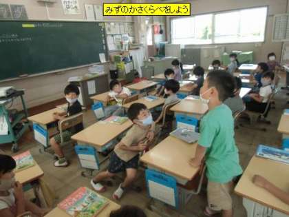 1年4組の算数は、ビンや容器に入っている水のかさを比べる方法についてみんなで考えていました。子どもたちの考えは、「おなじおおきさのこっぷに入れてくらべる」「いっぽうのびんのみずを、もういっぽうのびんにうつしてくらべる」です。なるほど!説明も上手にできていました。