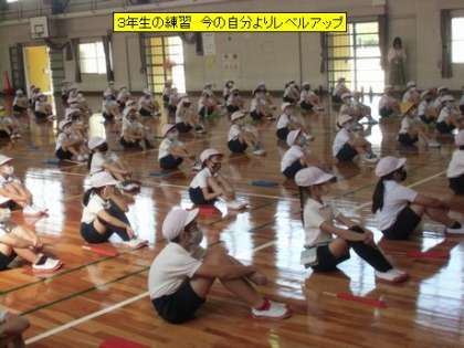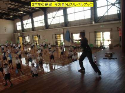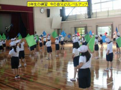 3年生も、今日の練習は体育館です。3年生の目標は、「One up 今の自分よりレベルアップしよう」です。今日の練習までに多くの子が自分で練習し、動きを覚えていました。担任の先生たちもびっくりしていました。今年の3年生の演技も旗を持ちます。色鮮やかな旗が、きれいに舞う様子が目に浮かびます。
