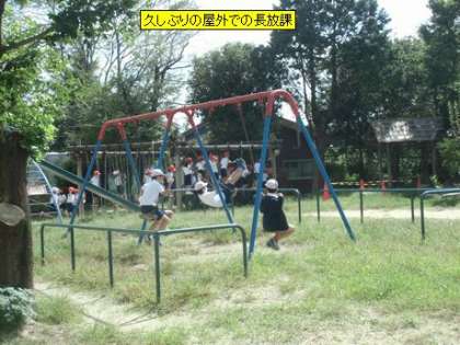 緊急事態宣言が解除となり、久しぶりに子どもたちが屋外での活動を楽しみました。どの子の顔も笑顔いっぱいで、楽しそうです。