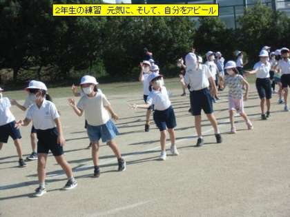 運動場で2年生の皆さんが、ダンスの練習をしていました。軽快なリズムにのってみんな楽しそうです。2年生の目標は、元気に表現して、去年よりレベルアップ。そして、自分をアピール。ダンスの中に自分で決めた動きがあるそうです。2年生のダンスも、楽しみです。