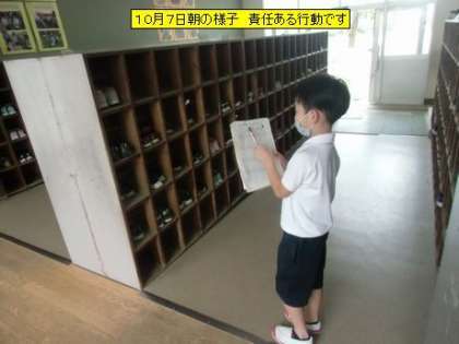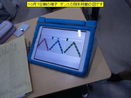 校舎内を回ると、係活動に取り組んでいる子がいます。自分の仕事に一生懸命です。2年生の教室に行くと、たんけんグッズが机の上にきちんと用意されていました。気持ちが表れています。3年生の子のタブレットに、ダンスの隊形移動の図が送られてきていました。とても分かりやすい図です。