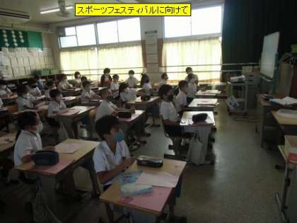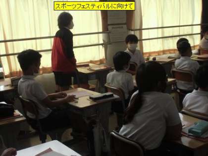 4年2組の皆さんが、ダンスの練習を終えて「スポーツフェスティバルに向けて」というテーマで話し合っていました。4年生になると自分たちの演技の全体を見て、課題を解決するための手立てを考えるようになります。「タイミングを合わせる」「旗の向きを気をつける」などの意見が出て、自分たちの演技を真剣に捉えて考えていました。