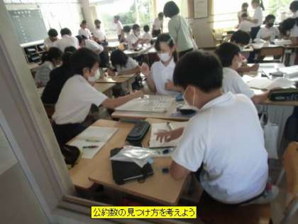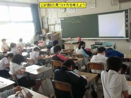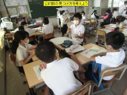 南から気持ちのよい風が吹き込む中、5年2組の皆さんが算数の授業をしていました。今日のめあては「公約数の見つけ方を考えよう」です。今日は「24と36の公約数」を見つけます。自分なりの考えをもってから、グループ学習に入りました。24の約数と36の約数両方をホワイトボードにかいている班が多くありました。他の見つけ方を一生懸命考えている班もありました。