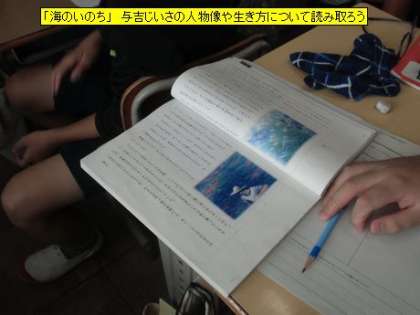 6年2組の国語の学習は「海のいのち」です。今日の授業のめあては「与吉じいさの人物像や生き方について読み取ろう」です。子どもたちは、本文の一つ一つの言葉を注意深く読み返し、与吉じいさいについて分かることをワークノートに書きだしていました。与吉じいさってどんな人なのでしょう。