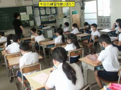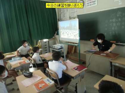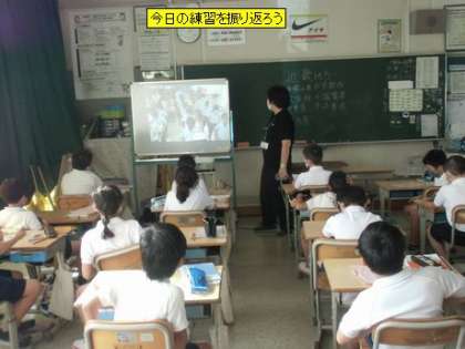 4年2組の教室に行くと、今日のダンスの練習の様子を映像で見せてくれました。今日初めて、オープニングからラストまでを通して行ったということです。「今日のできばえは100点満点で何点ですか?」と聞くと、「80点です」と答えてくれました。来週の下見会がとても楽しみです。