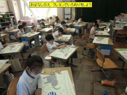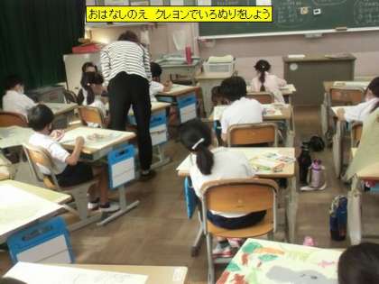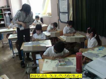図工 おはなしのえ クレヨンでいろぬりをしよう(1年1組)