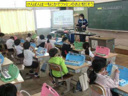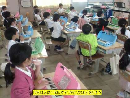 音楽 けんばんはーもにかでファとソのおとをだそう(1年4組)