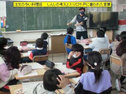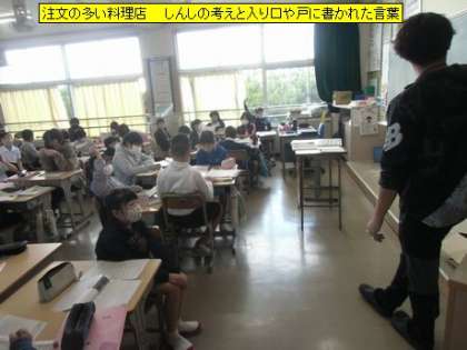 5年3組では、宮沢賢治の「注文の多い料理店」の学習をしていました。入り口や戸に書かれた言葉に反応する紳士の行動にこの物語の面白さがあります。言葉の本当の意味について考えながら、この物語の主題に気付かせたいと思います。