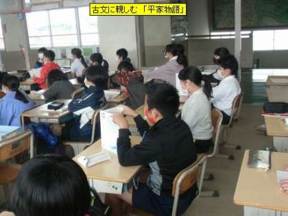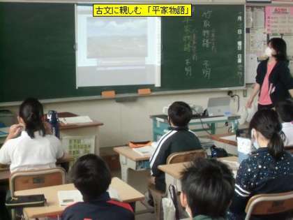 5年2組に行くと、「平家物語」の冒頭部分をみんなで朗読していました。繰り返し朗読しているうちに、覚えてしまう子もいました。古文独特の言い回しやリズムがあり、慣れ親しむうちに頭の中に入ってくのでしょう。5年生では、平家物語の他に「竹取物語」「徒然草」「おくのほそ道」を読み、味わいます。