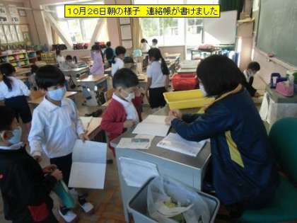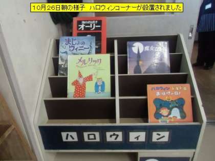 昨夜の雨も上がり、子どもたちが元気に登校してきました。教室を回ると、図書室には新たにハロウィンコーナーが設置されていました。子どもたちの人気の本になりそうです。1年生の教室では、朝の先生とのやりとりが始まっていました。