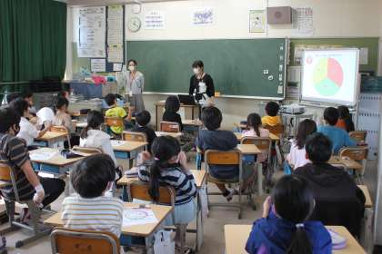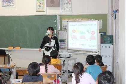 明治食品から講師の方に来ていただき、朝食の大切さについて学びました。どんな食べ物が栄養バランスがよいのか知りました。朝食を食べて、元気で過ごせるといいですね。
