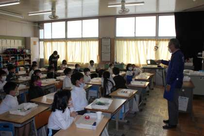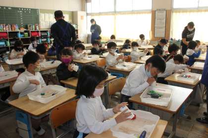 講師の方から手作りおもちゃの説明を聞き、音の出るおもちゃを作ることができました。コップの大きさで音が違うことに子どもたちは驚いていました。2−2も本日行いました。2−3、2−4は、明日行う予定です。