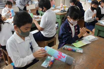 「あきようきのへんしん」の学習に取り組んでいました。家から持ってきたようきの形から、どんな作品にしようかイメージをふくらませました。絵の具を粘土に混ぜたものを容器に付けて、小物入れを完成させていました。