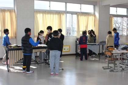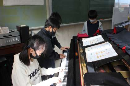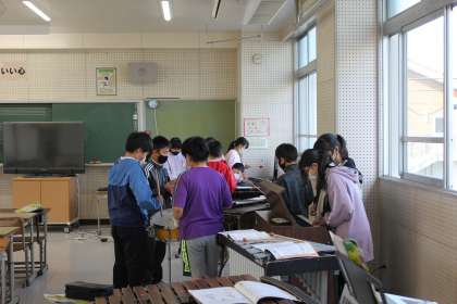 「リボンのおどり」の合奏をするために、グループで練習していました。楽譜を見ながら、リズム通りに演奏していました。