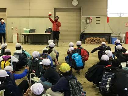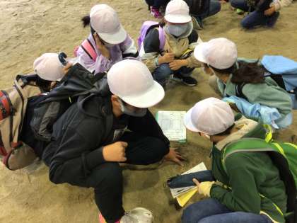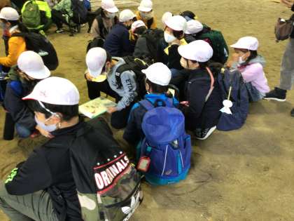 山の学習の最初の活動は、オリエンテーリングです。職員の方の説明を聞き、グループの作戦を立てて出発です。オリエンテーリングはグループの協力が必要です。さあ、出発です。