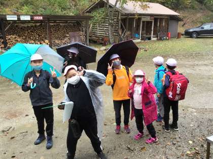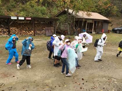 霧雨のような雨が降っていますが、子どもたちはカッパを着て山の中へ入っていきます。