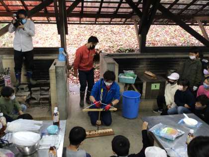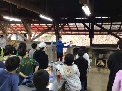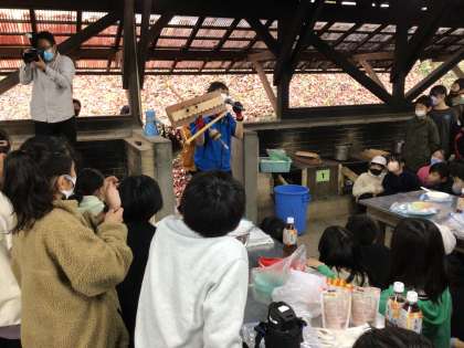 ただ今写真立てつくりと火おこしの説明中です。みんなしっかり聞いています。