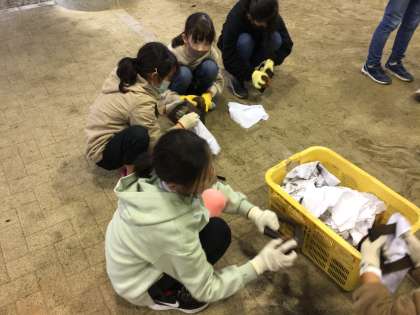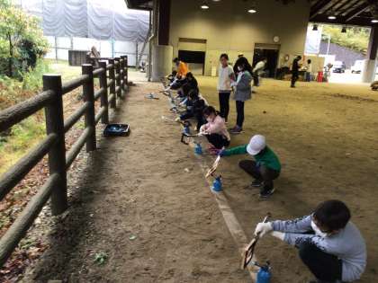 かまどに火がついたら、写真立てつくりをします。木枠に焦げ目をつけるところまで行います。たわしと布で磨くと、光沢がでます。