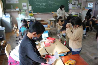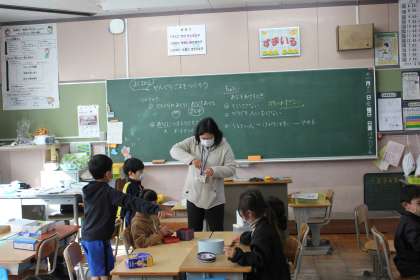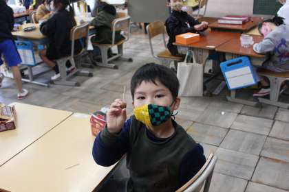拾ったどんぐりで、こまを作っていました。きりを使い、どんぐりの中心に穴を開けていました。