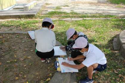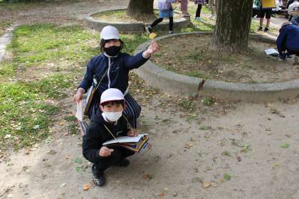 生き生きランドで秋見つけをしていました。いちょうやかえでなどの色の違いをノートに細かく書いていました。