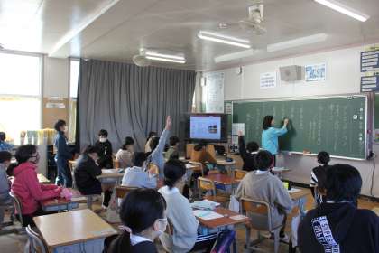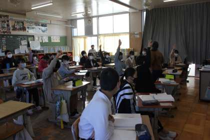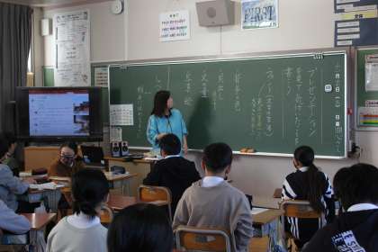 プレゼンテーションの画像から気付いたことを考えていました。聞いている人に伝わるためには、どんな点を工夫すればよいかみんなで意見を共有していました。