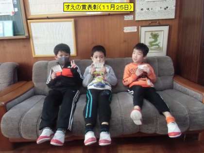 今日は、すえの賞の表彰で23人のすえのっ子が校長室に来てくれました。担任の先生から「友達が水筒を倒してこぼしてしまった時、すぐにぞうきんを取ってきて一緒に片付けてくれました。とても優しい子です」「給食をなんでもたくさんよく食べます。早く食べると片づけを手際よくやってくれます。いつも笑顔でげんきいっぱい、大きな声ではっきり話す姿もすばらしいです」「友達が困っている時、『ぼくやるよ』とやさしく声をかけるところがすてきです」などの報告がありました。みんなで記念写真を撮りました。