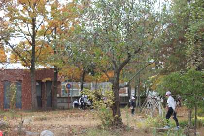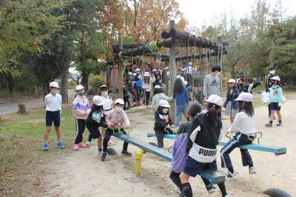 いききランドで落ち葉やどんぐりをたくさん拾っていました。これを使い、さつまいものつるで作ったリースの飾りにする予定です。拾った後、友達と仲良く遊具遊びをしました。