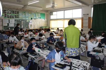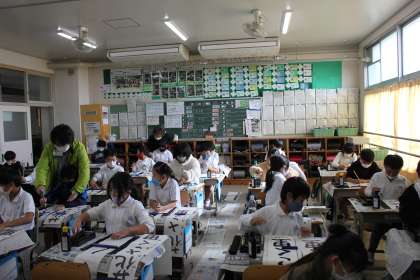 お手本を見ながら、真剣に取り組んでいました。書写ボランティアさんから大切なポイントを教えていただけました。