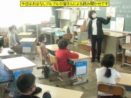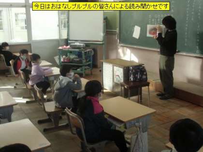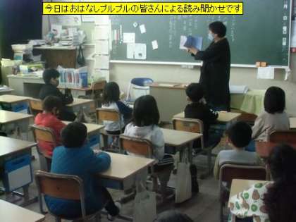 今日は、おはなしプルプルさんによる読み聞かせの日です。低学年の子は、読み聞かせが始まると、身を乗り出すように聞き入ります。思わず声が出たり、笑顔になったり、素直な反応がかわいいです。