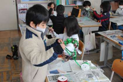 サツマイモのつるで作ったリースの飾り付けを楽しそうにしていました。リボンを巻いたり、クリスマスの飾りをどんなふうに付けようか考えたりして活動していました。